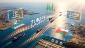 Large crude carriers often travel through critical maritime corridors such as the Strait of Hormuz, one of the most important oil transit chokepoints in the world. Nearly 20% of global oil trade passes through this narrow passage linking the Persian Gulf with international markets.